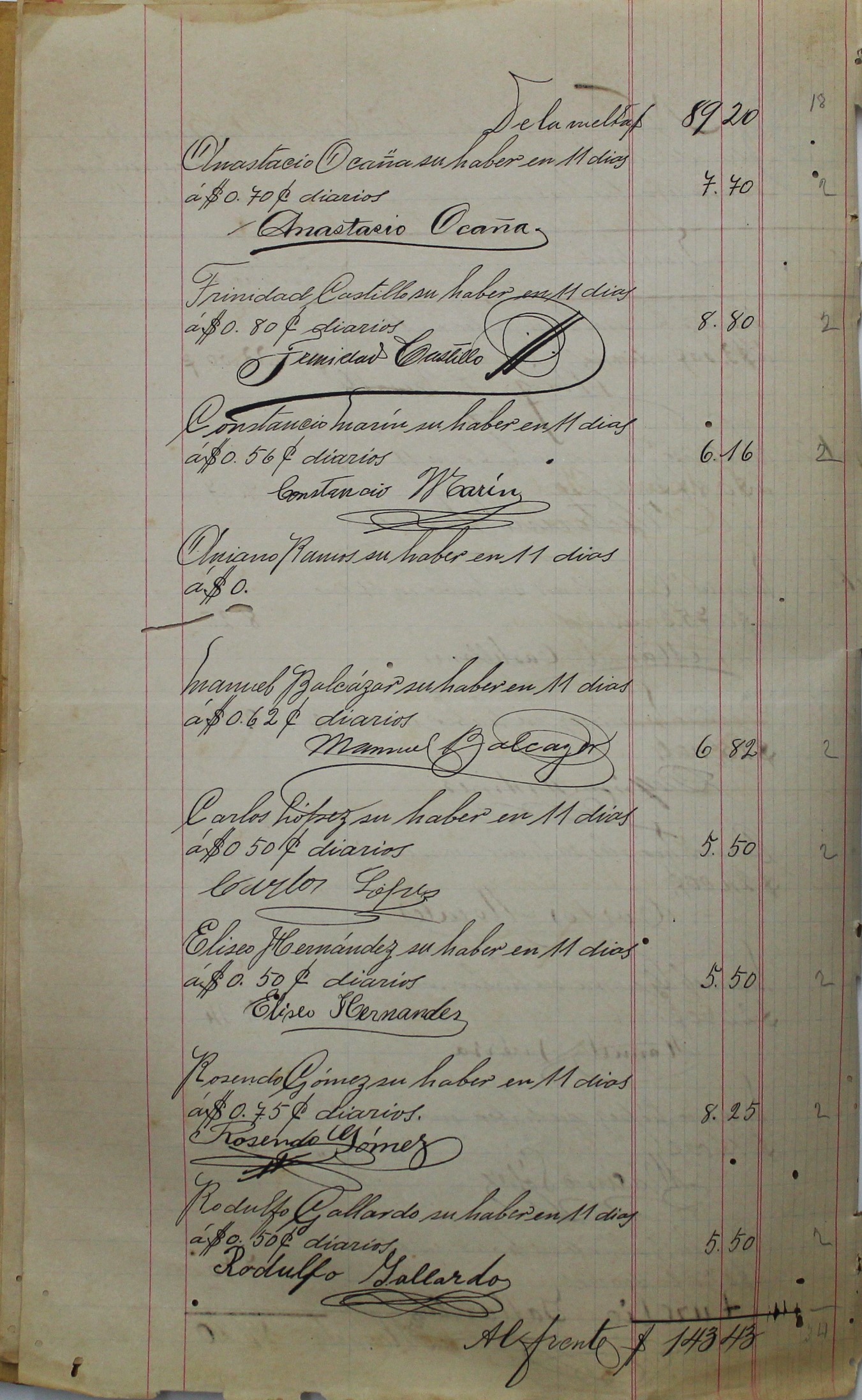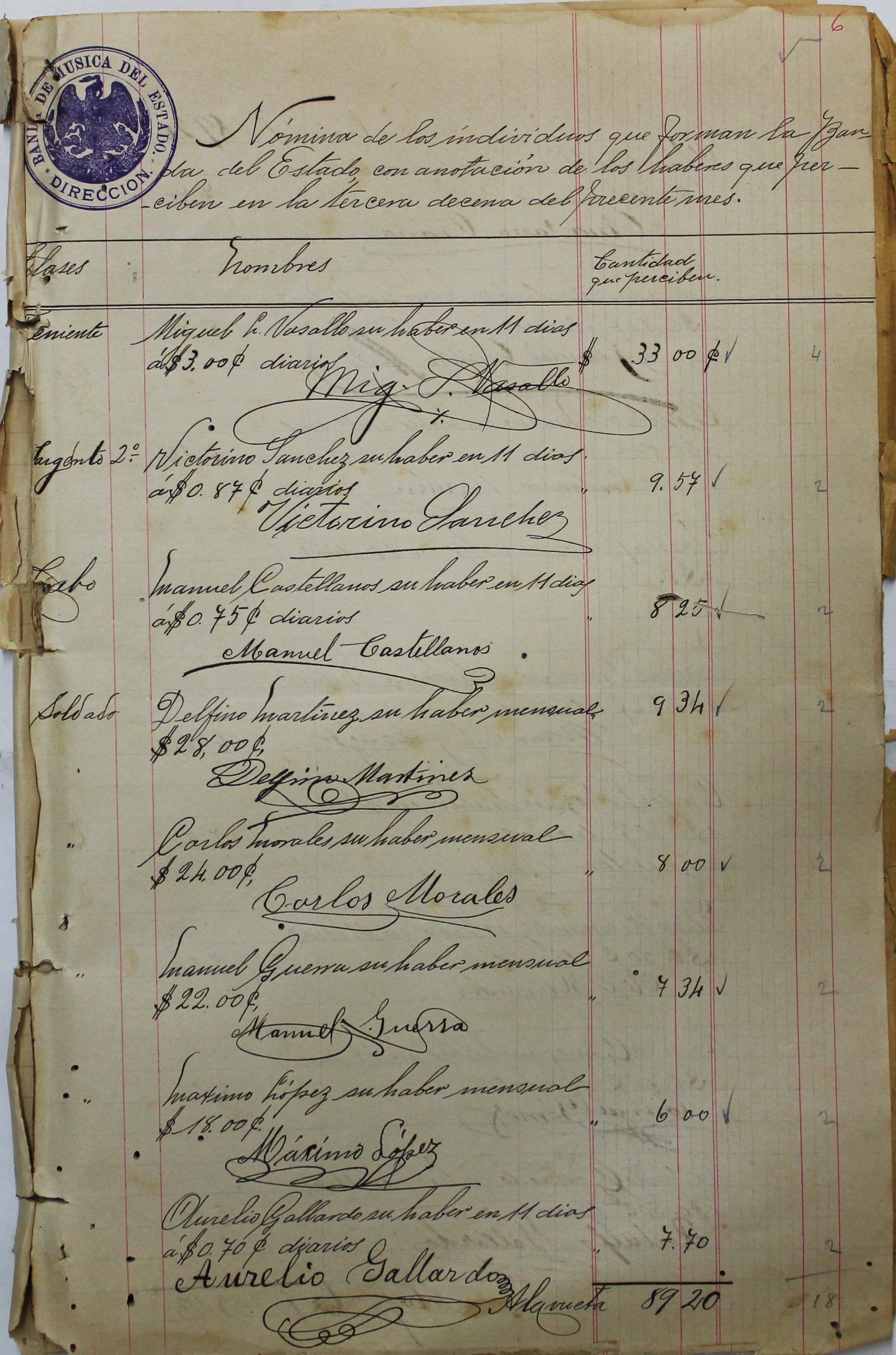 • Documentos (nóminas de sueldos de la Banda de Música del Estado, 1913. Archivo General del Estado, Fondo: Tesorería General del Estado, Tomo 011. Clasificación AH.TGE.E-1913.011.