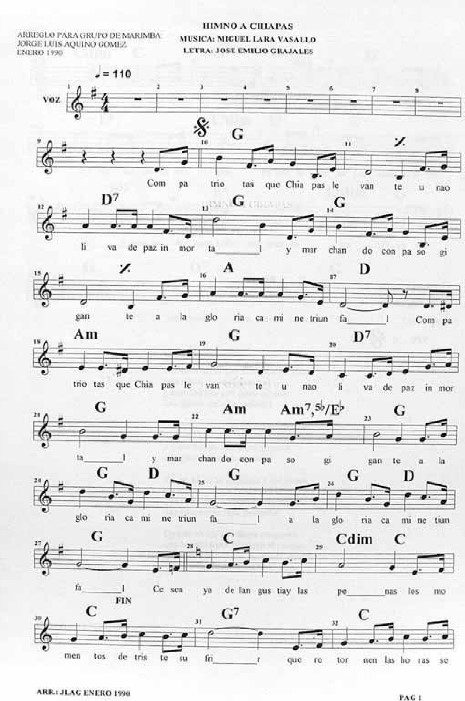 Letra del Himno a Chiapas Publicada en la Ley del Escudo y el Himno de Chiapas, de 22 septiembre de 2010 (P.O. #253)